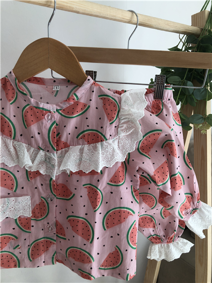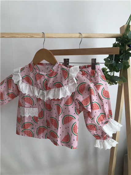 %100 pamuklu kumaştan, fistolu dantel detaylı, düğmeli uzun kollu, karpuz desenli pijama.