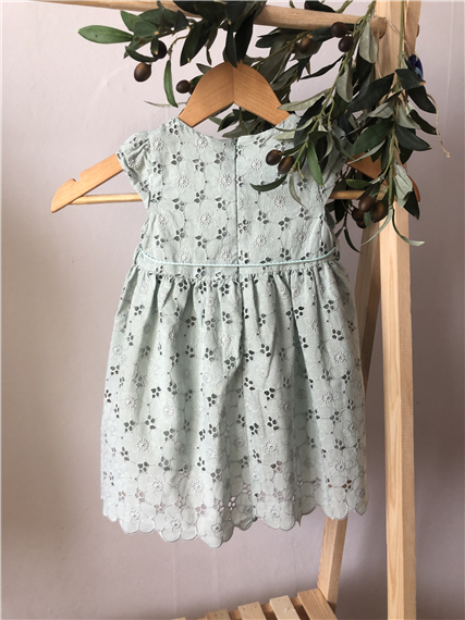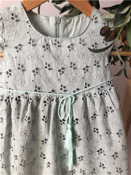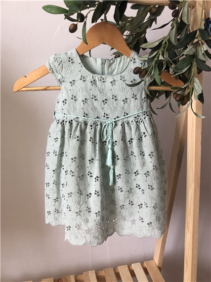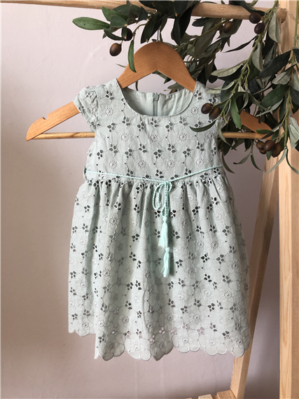 Çıtır çıtır, kibar puffinlere kır bahçelerine uygun; içi astarlı, pamuklu fistolu kumaştan mint renginde, incecik güpür elbise.