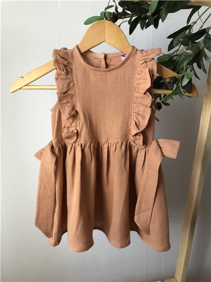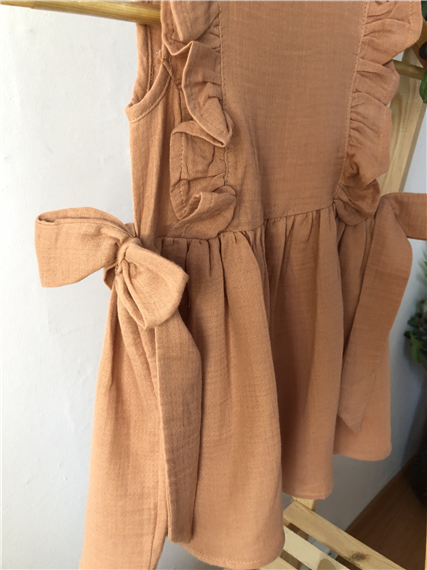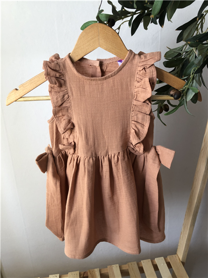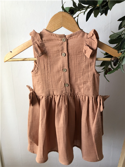 Pamuklu kumaştan yumuşacık, fırfırlı fiyonk detaylı, düğmeli Elbise.